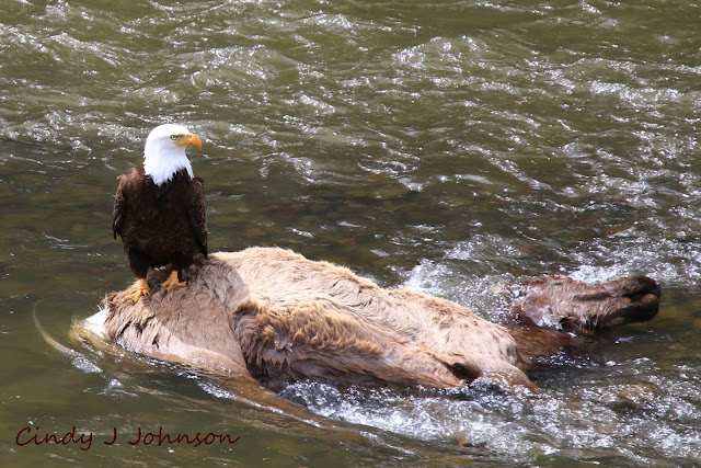We had our lunch while we watched and finally headed back thru Lamar Valley. Where the Lamar River goes thru Lamar Canyon I had seen 2 Ravens sitting on something in the river - I tho't that was odd until I figured out it was a carcass so as we came back thru we stopped to find it.