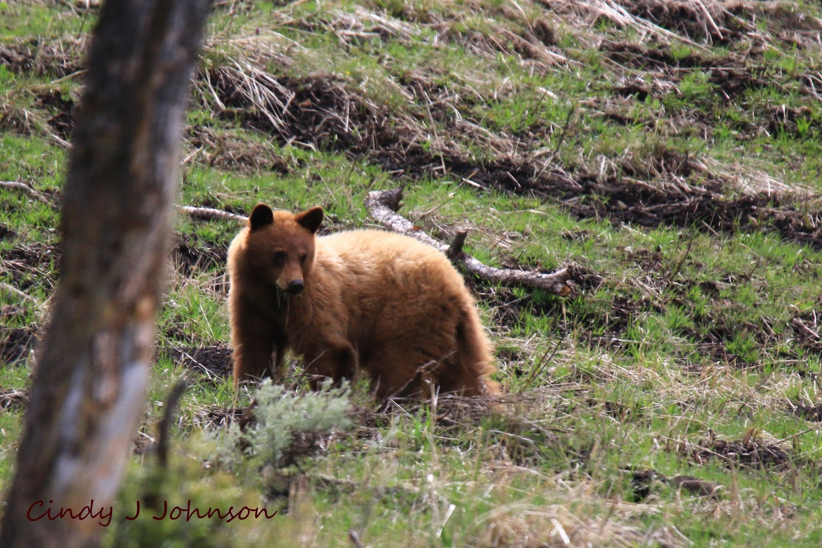The Black Bear was either gone from his carcass or just snoozing so we couldn't see him so it was a quick stop for us. But down at the Yellowstone River Bridge we found cars lining the road. They had spotted a Cinnamon Black Bear just off the road.
